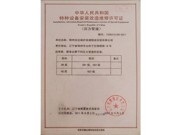 特種設(shè)備安裝改造維修許可證(壓力管道)